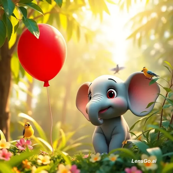 A vibrant, warm, 3D animated style scene of a sunny morning in a lush tropical forest. Sunlight streams through the soft green leaves. A very cute, small baby elephant (Gappu) with large eyes and a friendly expression is looking curiously at a large, bright red balloon trapped in some bushes. A small, cheerful sparrow (Titu) is perched on a nearby branch. Colorful flowers are on the forest floor. High quality, detailed texture, Pixar-like animation style.