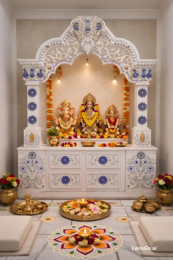 Luxury handcrafted white marble home temple interior, intricately carved Indian mandir with detailed floral nakashi work and blue inlay patterns, symmetrical design with pillars and arch, featuring idols of Lord Ganesha, Goddess Lakshmi and Goddess Saraswati placed inside, decorated with fresh marigold garlands and flowers, warm ambient lighting with hanging bulbs, traditional brass pooja thali, diya lamps and decorative items placed in front, marble flooring with rangoli and flower arrangement, soft beige textured wall background, elegant and peaceful spiritual atmosphere, ultra realistic, high detail, 4k, cinematic lighting, front view, perfectly centered composition