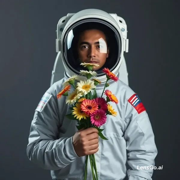 AI Image: Studio portrait of an astronaut holding flowers, dramatic lighting