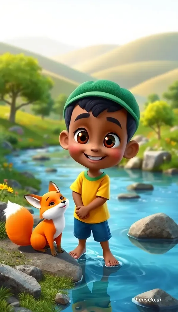 A high-quality 3D cartoon style illustration of a young Somali boy named Hirsi playing with his fox best friend near a clear flowing river. Hirsi has warm brown skin, big expressive eyes, short black hair, wearing a green cap, yellow t-shirt and blue shorts, barefoot and smiling happily. The fox is small, fluffy, bright orange with white chest and tail tip, playful and friendly. They are in a beautiful green landscape with trees, flowers, rocks, and soft sunlight. Background includes rolling hills.