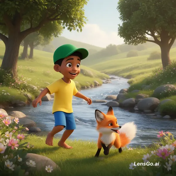 A high-quality 3D cartoon style illustration of a young Somali boy named Hirsi playing with his fox best friend near a clear flowing river. Hirsi has warm brown skin, big expressive eyes, short black hair, wearing a green cap, yellow t-shirt and blue shorts, barefoot and smiling happily. The fox is small, fluffy, bright orange with white chest and tail tip, playful and friendly. They are in a beautiful green landscape with trees, flowers, rocks, and soft sunlight. Background includes rolling hills.