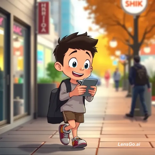 AI Image: Anime style animation of a cartoon boy walking while looking at his phone, funny expression, smooth