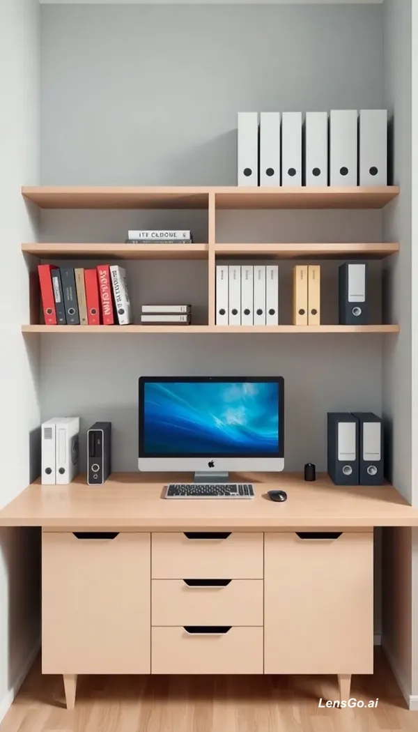 Using the provided image, please fill the room with a laptop and a computer screen on the desk, and fill the shelves with books and folders.