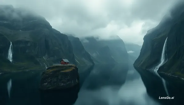 Dramatic Norwegian fjord with steep cliffs, cascading waterfalls, mirror-like water reflections, small red cabin on cliff edge, moody Scandinavian atmosphere, epic landscape photography, Lord of the Rings vibes