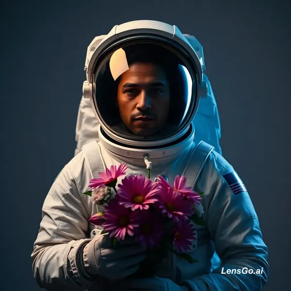 AI Image: Studio portrait of an astronaut holding flowers, dramatic lighting