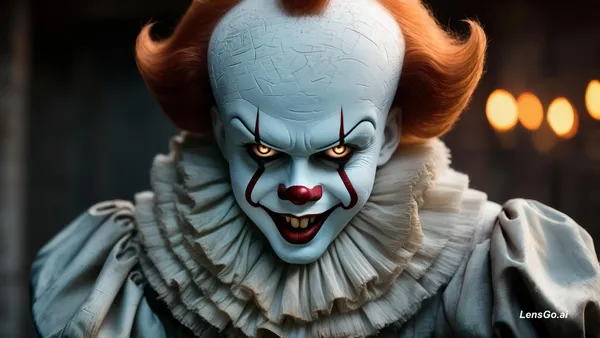 Scary story behind Pennywise, shot on modular 8K digital cinema camera, standard prime lens, 35mm standard natural perspective, f/1.4 shallow depth of field, creamy bokeh, professional cinematography, ultra-detailed, 8K resolution, film grain, cinematic color grading