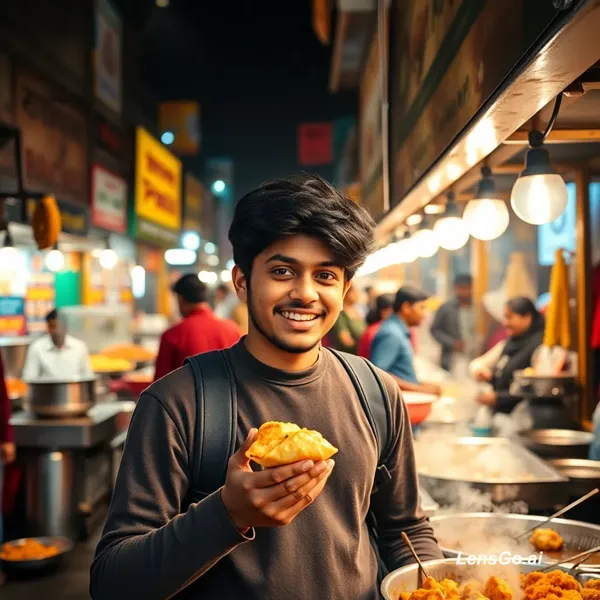 AI Image: Ultra realistic 4K cinematic street food vlog in India. A young Indian vlogger walking through a bus