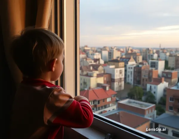 AI Image: generame una imagen de un niño viendo desde la ventana de su casa un paisaje urbano del siglo 50