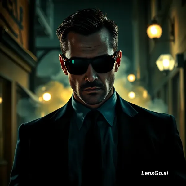 AI Image: Ultra realistic cinematic gangster portrait of a tough man, wearing a black suit and dark sunglasses