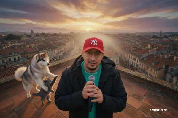 Cinematic aerial top shot looking down from the sky. The camera rapidly descends through the clouds towards a rooftop in a vintage European city during sunset. On the rooftop, a fluffy husky dog and a small gray cat are standing on their hind legs, dancing together gracefully. The cat twirls under the dog's arm. Warm golden hour lighting, soft shadows, slow motion, hyper-realistic, 8k resolution, film grain texture.