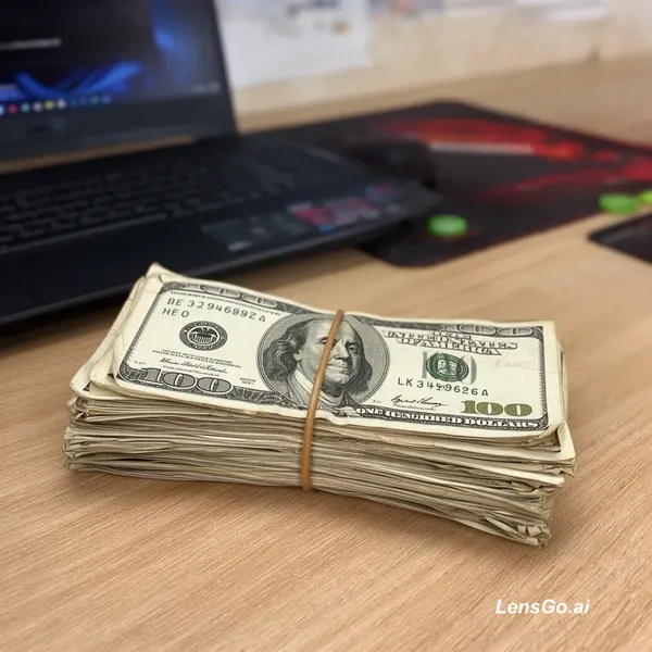 A stack of US $100 dollar bills, approximately 20-30 bills bundled together with a plain brown rubber band, placed flat on a wooden desk next to an ASUS gaming laptop. The bills are slightly worn and crumpled, with soft fold marks and light wear on the edges, looking like they've been handled many times. The bundle is positioned at a slight angle on the desk surface. Natural daylight lighting, realistic shadows and surface reflections matching the existing scene. Photorealistic, high detail, seamless integration with the original photo.