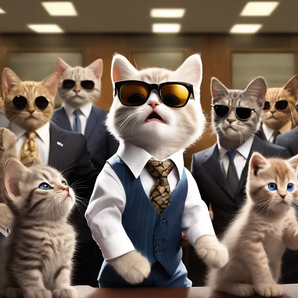 A cute kitten dressed like Leonardo DiCaprio in The Wolf of Wall Street, wearing a sharp suit, sunglasses, and holding a microphone while standing on a desk surrounded by cheering kittens in an office setting. The kitten strikes a confident pose, channeling DiCaprio’s iconic speech scene