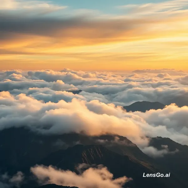 AI Image: Dramatic timelapse of clouds rolling over mountain peaks, golden hour to blue hour transition, epic