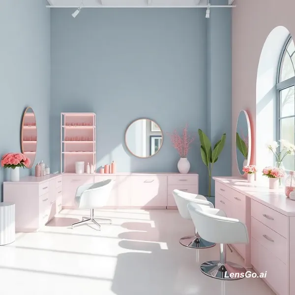 Soy una estudiante de grado superior de estilismo y dirección de peluquería podrías generar una imagen de un salón de belleza minimalista en colores azules, rosas y blancos que sean de gamas parecidas.