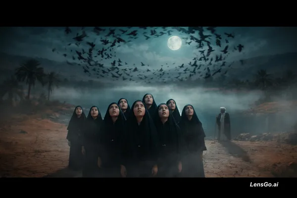 Medium-wide cinematic shot from a low-angle perspective facing a group of girls standing near a lake at night. The camera is positioned in front of the girls at a slightly low height, looking upward as the girls raise their heads toward the sky. The girls wear black traditional clothing covering their hair with black viel, their faces illuminated by cold moonlight from above, creating dramatic shadows under their eyes. Heavy fog surrounds the area, creating a mysterious and tense atmosphere. Above them: Numerous black crows flying in continuous circular motion forming a large ring in the sky. Action: The girls watch the sky with fear and anticipation.