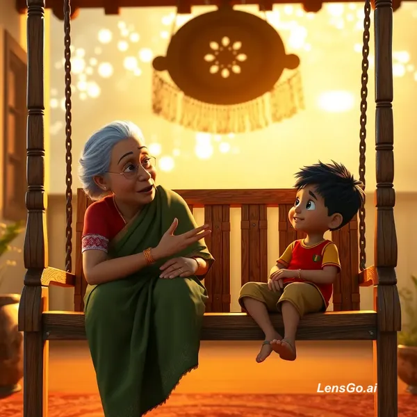 "An emotional 3D animation of an Indian grandmother sitting on a wooden swing (jhoola) with her little grandson. Warm sunlight, traditional Indian home setting. The grandmother is explaining something with hand gestures while the grandson looks at her with wonder. Soft cinematic lighting, high-quality textures, Pixar-style character design."