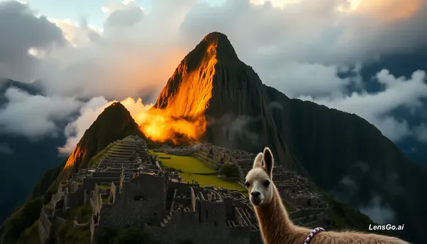 Machu Picchu ancient Incan citadel emerging from morning clouds, dramatic mountain peaks, llama in foreground, golden sunrise light illuminating stone temples, mystical atmosphere, adventure travel photography, epic landscape
