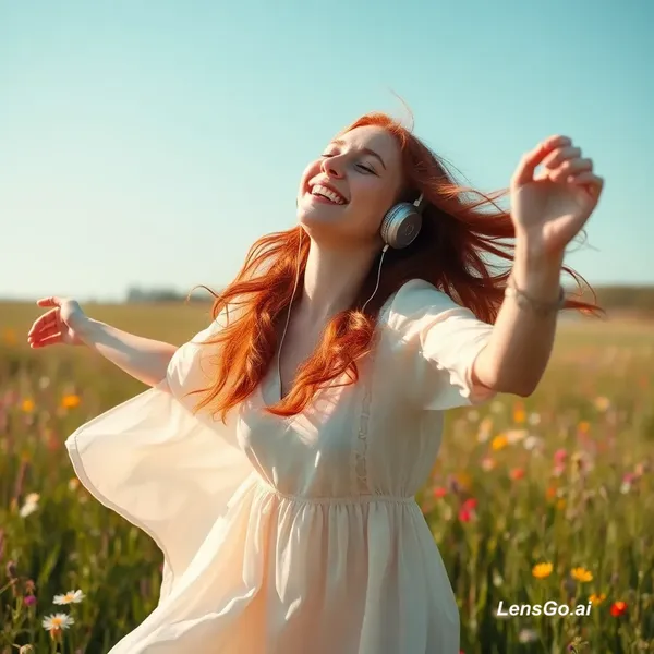 A joyful red-haired woman dancing freely in a flower-filled meadow under a clear blue sky, wearing flowing light dress and wireless headphones, her eyes closed, smiling, hair and fabric moving in the wind, dreamy natural light, soft focus, ethereal mood, wildflowers all around, sense of freedom and presence