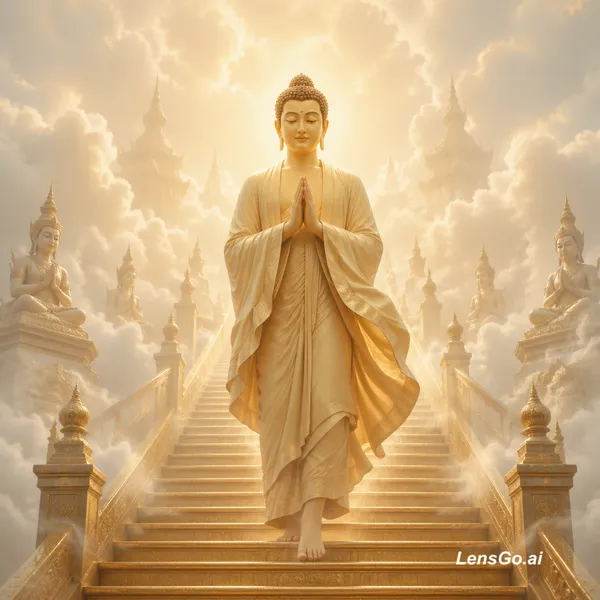 AI Image: A sacred, ultra-peaceful scene of Gautama Buddha gently descending a golden staircase from the sky.