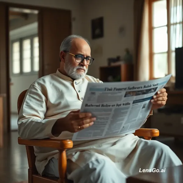 AI Image: A middle-aged Indian father sitting on a wooden chair in a simple living room, reading a newspaper s