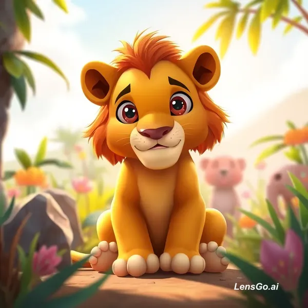 AI Image: 3D cartoon style cute baby lion sitting in colorful jungle, soft sunlight, big expressive eyes, chil