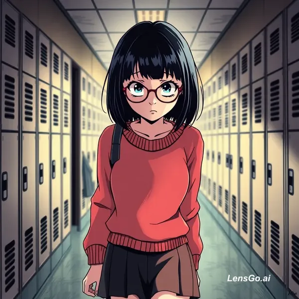 A girl walking in a School haunted hall with lockers. She shas glasses, Bob cut black hair, hearing a mini skirt with a Rosy sweater. She ia Very aprehensive and afraid. The scene cut to close up her eyes in frighting terror