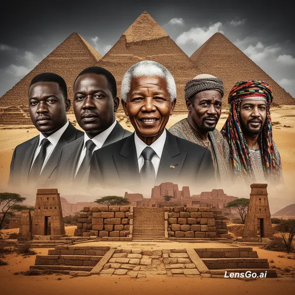 Realistic high contrast style 4k image of African heroes lumumba , nkrumah, Mandela, gaddafi , santana in front and some African historical sites pyramids of giza ,great Zimbabwe and mali