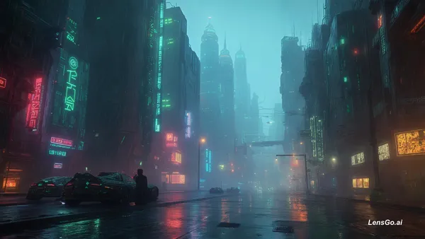 Cyberpunk neon-lit street scene, rain-soaked asphalt reflecting colorful signs, futuristic architecture, atmospheric fog