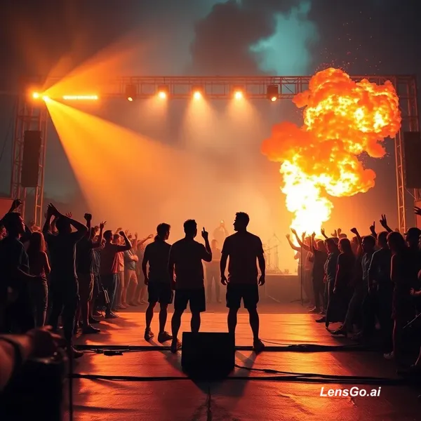 A high-energy, cinematic showdown unfolds at the edge of a summer music camp stage, where determination and intensity collide. *Can't Back Down* drives the scene forward like a rallying cry-figures standing together under harsh, golden stage lights, fists clenched, voices rising in unity. There's tension in the air, like a battle for identity and purpose, but also strength in refusing to retreat. Across from them, *Fire* ignites the atmosphere-flames of color and sound erupt through the stage floor, turning performance into pure chaos and passion. The same space feels like it's burning with ambition, every beat shaking the ground, every spotlight flaring like a spark that refuses to be contained. The crowd becomes part of the storm-silhouettes swaying between support and pressure, as if the entire moment is a test of who can stand their ground when everything is loud, hot, and uncertain. At the center, the energy fuses: resilience meets intensity. It's not about backing down or burning out-it's about holding steady while everything around you turns into fire.