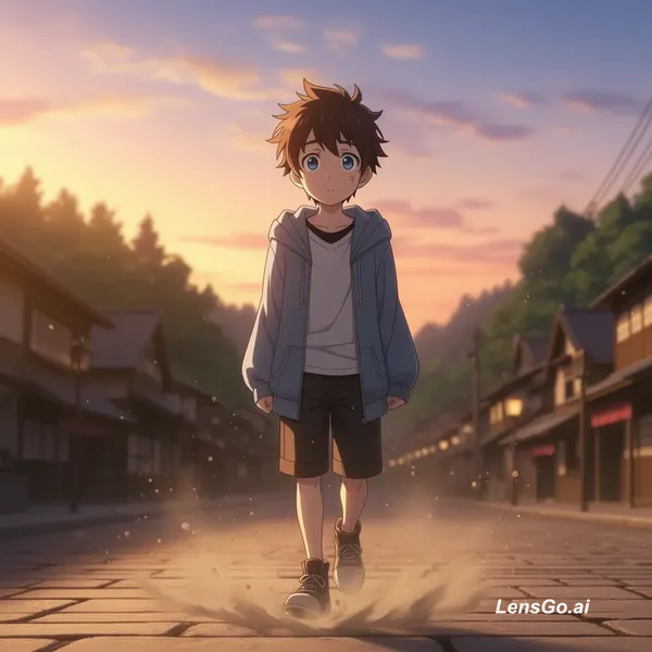 AI Image: A young anime boy named Rokan stands quietly in a peaceful village at sunset. The camera slowly zoom