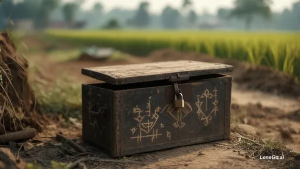 एक छोटे से गांव में राहुल नाम का एक लड़का रहता था। एक दिन खेतों के पास उसे एक पुराना, धूल से भरा बॉक्स मिला। बॉक्स पर अजीब निशान बने थे और उसमें एक छोटा सा ताला लगा था।, shot on modular 8K digital cinema camera, standard prime lens, 35mm standard natural perspective, f/1.4 shallow depth of field, creamy bokeh, professional cinematography, ultra-detailed, 8K resolution, film grain, cinematic color grading