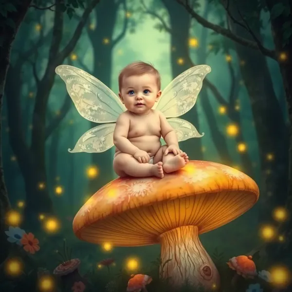 Enchanted fantasy photography of the baby from the reference photo sitting on a giant mushroom in a magical forest. The baby has delicate, translucent fairy wings and is surrounded by glowing fireflies. Whimsical, storybook illustration style.