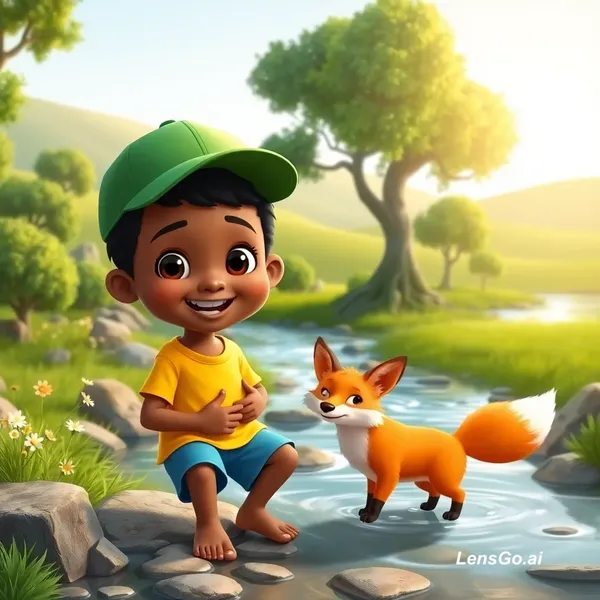 A high-quality 3D cartoon style illustration of a young Somali boy named Hirsi playing with his fox best friend near a clear flowing river. Hirsi has warm brown skin, big expressive eyes, short black hair, wearing a green cap, yellow t-shirt and blue shorts, barefoot and smiling happily. The fox is small, fluffy, bright orange with white chest and tail tip, playful and friendly. They are in a beautiful green landscape with trees, flowers, rocks, and soft sunlight. Background includes rolling hills.
