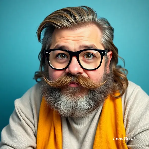AI Image: Aymen un mec un peu obese grand lunette cheveux long gras, bouclé moche avec une moustache et un bon