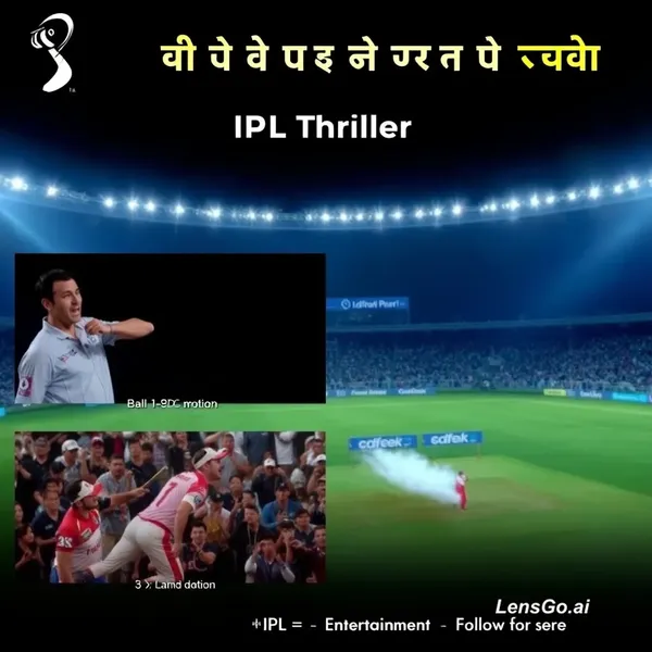 Title: "IPL में आखिरी गेंद का चमत्कार 😱🔥" ⏱ Duration: ~35 सेकंड 🎥 Scene 1 (0-4 sec) 🎵 High-energy music Text on screen: "IPL Thriller 😳" Commentator: "आखिरी ओवर... 10 रन चाहिए!" 🎥 Scene 2 (4-12 sec) 🎵 Tension build Ball 1 → FOUR 🔥 Fan: "आ गया मैच में ट्विस्ट!" 🎥 Scene 3 (12-20 sec) Ball 2 → DOT 😬 Ball 3 → 2 runs Commentator: "अब 4 गेंद में 4 रन!" 🎥 Scene 4 (20-28 sec) 🎵 Slow motion Ball 4 → OUT 😱 Fan: "अब गया मैच!" 🎥 Scene 5 (28-35 sec) Last Ball → SIX 🚀🔥 🎉 Crowd shouting Commentator: "छक्का!!! ये है IPL का असली मजा!!!" 🎬 Outro (35-40 sec) Text on screen: "IPL = Entertainment 🔥 Follow for more!" Create in 2 d