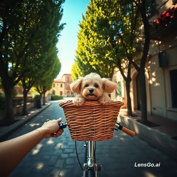 Wide-angle first-person view, hands of a young woman holding a bicycle handlebar, a wicker basket attached to the bike with a toy poodle inside. The dog's curly fur flutters softly in the breeze, head slightly raised, eyes squinting from the wind, with a cheerful and elegant expression. The bicycle rides along a narrow stone-paved road through an archway of tall green trees, sunlight filtering through the leaves, creating moving spots of light and shadow on the road and hands. Italian village details in the background: terracotta roofs, balconies with flowers, wooden shutters. Clear sunny day with a deep sky gradient from rich blue above to lighter near the horizon, sense of endless road perspective, calm warm atmosphere, gentle wind motion.