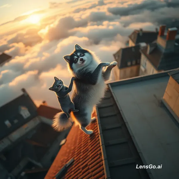 Cinematic aerial top shot looking down from the sky. The camera rapidly descends through the clouds towards a rooftop in a vintage European city during sunset. On the rooftop, a fluffy husky dog and a small gray cat are standing on their hind legs, dancing together gracefully. The cat twirls under the dog's arm. Warm golden hour lighting, soft shadows, slow motion, hyper-realistic, 8k resolution, film grain texture.