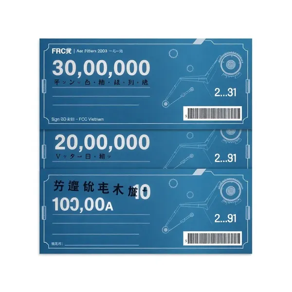 Design a professional voucher set inspired by a Japanese industrial manufacturing company (similar to FCC Vietnam). Use a modern, clean, high-tech engineering style. Color palette: blue, grey, silver, white. Include denominations: 3,000,000 VND (1 voucher) 2,000,000 VND (1 voucher) 1,000,000 VND (1 voucher) 500,000 VND (10 vouchers) Clean structured layout with the value prominently centered. Modern technical typography. Subtle mechanical and geometric elements, metallic accents. Must include: "Signing Date: __________" Below it: "Signature: __________" with a clear signature line Place these at the bottom area with enough empty space for handwriting. Include voucher code area. Style: corporate, minimal, precise, industrial, professional. High resolution, sharp details.