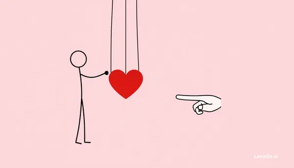 stick figure style drawing, a red heart attached with puppet strings controlled by another stick figure hand, simple vector lines, minimal design, soft pink background, youtube thumbnail composition, clean stick figure illustration