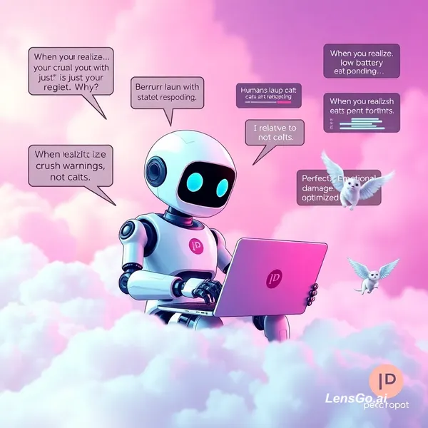 Theme: Funny brainrot skit — “AI Learns What a Meme Is (and Regrets It)” Style: Chaotic, fast-paced, pastel aesthetic with glitch effects and meme-style cuts. Visuals: - A confused robot sitting at a laptop in dreamy pink, purple, and blue cloud background. - Robot tries to understand memes, screen flashes with absurd captions like “When you realize your crush is just a data point”. - Glitchy transitions when AI malfunctions (Error: humor.exe has stopped responding). - Quick meme cutaways: cats, low battery icons, “system32 deleted” joke. - End with your peach logo + kittens with wings flying past. Script Lines to Use: 1. 🤖: “Humans laugh at… cats with captions? Why?” 2. 💻: “Because it’s relatable.” 3. 🤖: “I relate to low battery warnings, not cats.” 4. 💻: “When you realize your crush is just a data point.” 5. 🤖: “Perfect. Emotional damage… optimized.” 6. 💻: “Error: humor.exe has stopped responding.” 7. 🤖: “Subscribe before I accidentally delete myself again.” Outro: - Show Laughgorithm logo with glowing text: “New Video Every 2nd Day 🍑✨” - Background: pastel clouds + kittens with wings.
