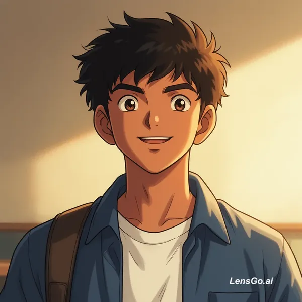AI Image: Anime style portrait of a young Indian college boy, dark hair, warm brown skin, casual college outfi