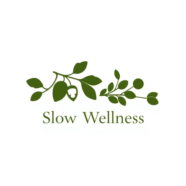 Minimalist vector logo design. A harmonious composition of a realistic oak branch with detailed acorns and a eucalyptus branch with rounded leaves. Flat 2D silhouette style, botanical precision, clean sharp outlines. The text "Slow Wellness" is elegantly integrated, arched around the plants. No shadows, no gradients, no 3D depth. Solid deep olive color on a plain white background. High contrast, professional graphic emblem for embroidery.