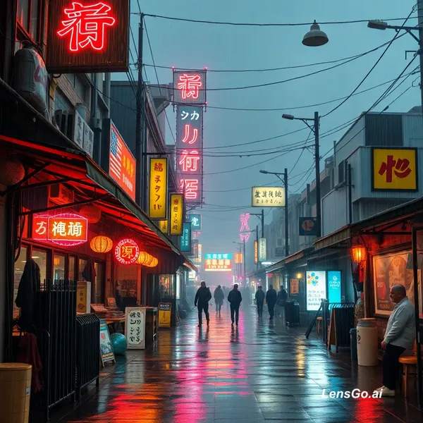 AI Image: Cyberpunk street market in the rain, neon signs and steam rising