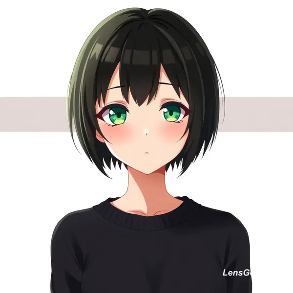AI Image: Anime girl with short black hair to her neck and green eyes