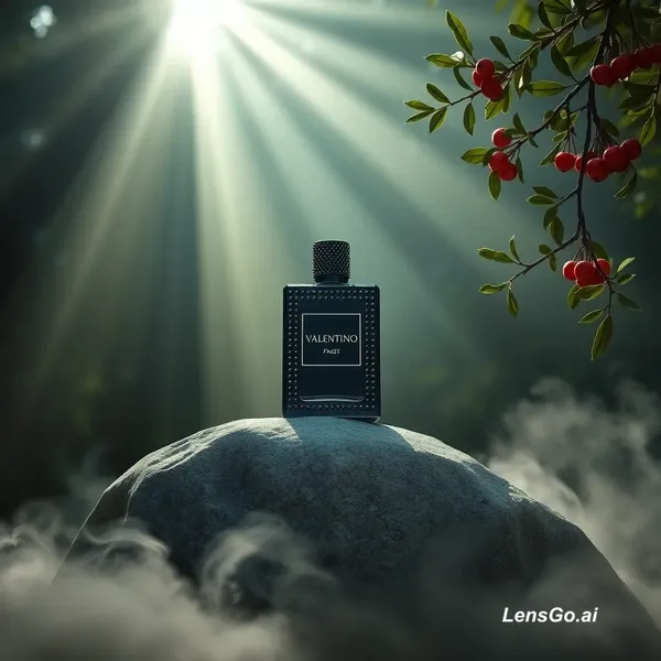 A high-end cinematic product photograph of a black studded glass perfume bottle with a "VALENTINO" label, centered on a large, flat, light-grey textured river stone. The scene is set in a lush, misty jungle at dawn. Intense, solid white sunbeams (God rays) pierce through the dense canopy from the upper left, casting dramatic light and shadows across the scene. To the right, a branch with small green leaves and clusters of bright orange-red berries hangs into the frame. Swirling white mist and low-lying fog surround the base of the stone. The background is a soft-focus blur of deep green tropical foliage and vines. Low-angle shot, hyper-realistic, 8k resolution, ethereal lighting, luxury advertisement style.