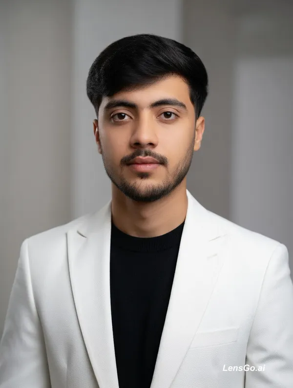 "Use the face from the provided reference image to generate a realistic portrait of the same person. The person is standing upright, facing directly toward the camera. He is wearing a stylish white suit with a black sweater underneath, creating a clean and elegant contrast. His posture is confident and composed, with a calm and slightly serious expression. The lighting is soft and professional, highlighting facial details and fabric textures realistically. The background is minimal and modern (studio or soft gradient). Highly detailed, sharp focus, realistic skin texture, professional fashion photography style, 4K quality."