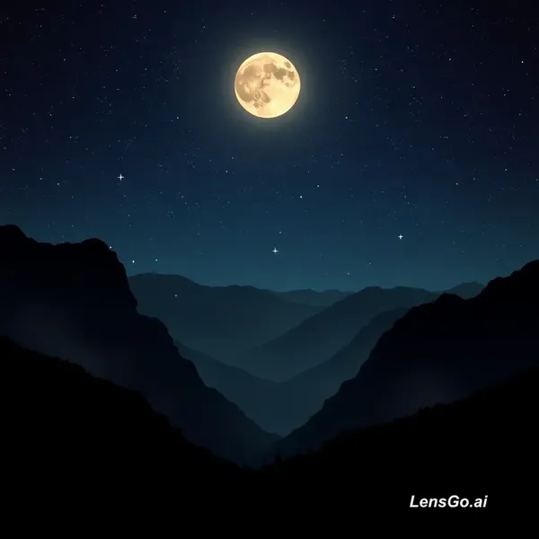 AI Image: dreamy night mountains, moonlight, stars glowing, romantic atmosphere, cinematic, soft wind, emotion
