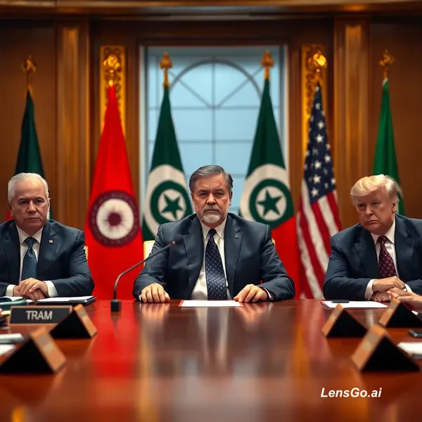 A cinematic, ultra-realistic scene of Shehbaz Sharif sitting at the center of a large diplomatic table, mediating tense talks. On his right side sits an Iranian leader in traditional attire, calm and composed. On his left side sits Donald Trump in a formal navy suit, leaning slightly forward. Behind them are the flags of Pakistan, Iran, and the United States. The room is a high-end international conference hall with soft golden lighting, microphones, documents, and nameplates on the table. Serious expressions, global diplomacy atmosphere, depth of field, ultra-detailed faces, 8K resolution, dramatic lighting.
