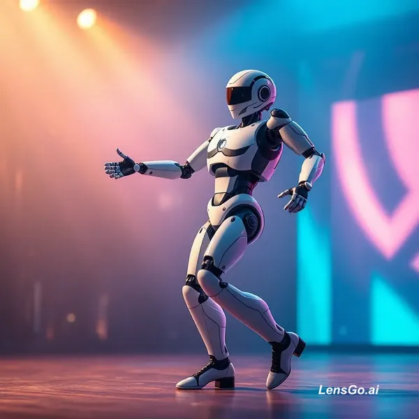 AI Image: A robot dancing energetically on a stage, cinematic lighting, smooth body movement, trending dance s