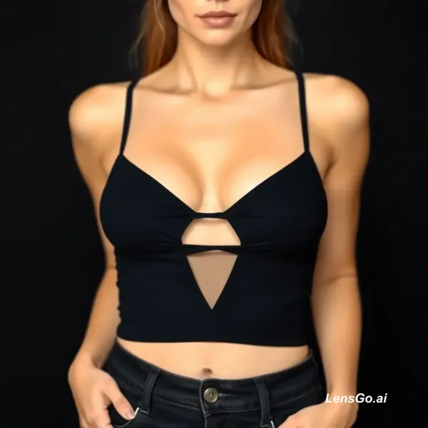 AI Image: "A fitted black crop top, exposing the midriff. Curvy body type shape. Tight clothing style, attract